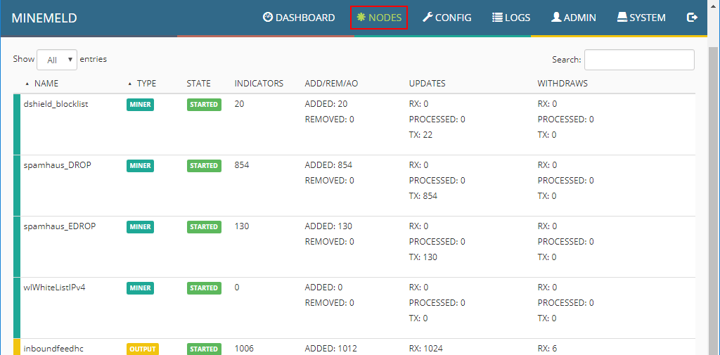 MineMeld uses three different entities that it calls “nodes” to automate the flow of indicators from source to destination. They include the following: