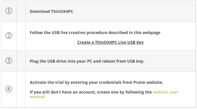 You can download a trial version of the ThinOX4PC software from the Praim website. It is extremely easy to get the Live USB key created which allows either installing the thin client software or booting the live environment.