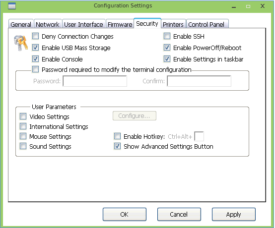 Additionally, when ThinOX4PC is used in conjunction with ThinMan Server, there are a myriad of configurator options that allow administrators to control the access and configuration of the thin client device. In the configuration security settings, you can see there are quite a few options to control the user environment within ThinOX4PC and also controlling the configuration of the environment.