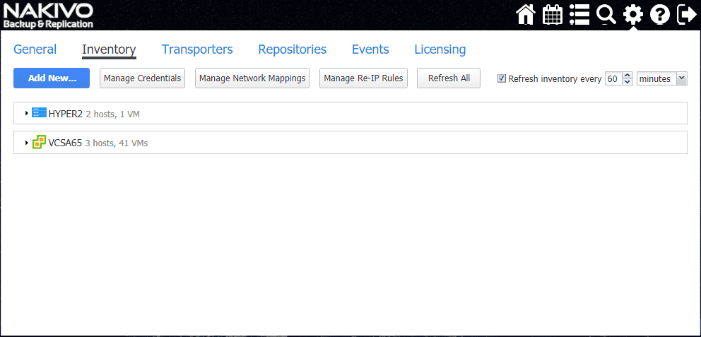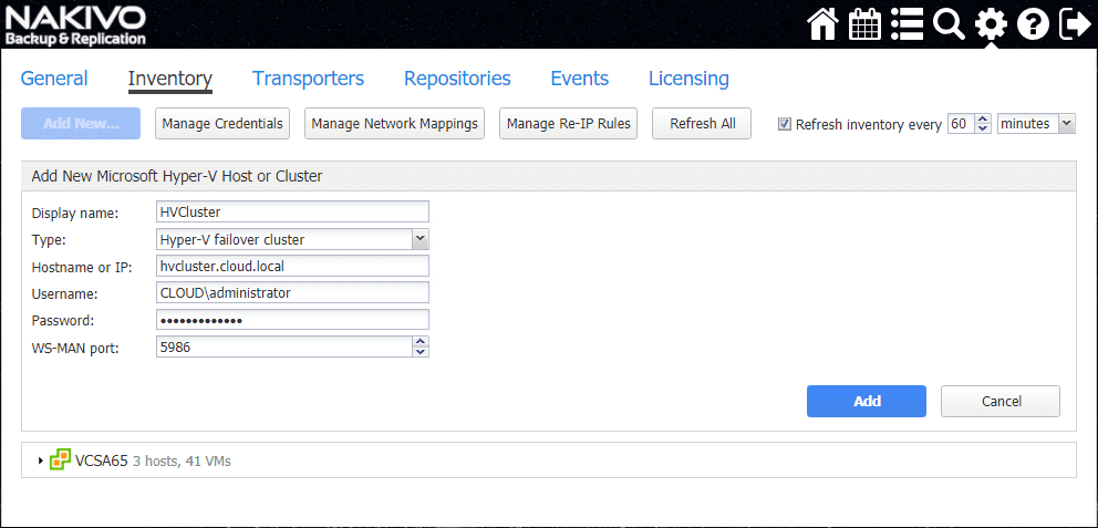 - Add your Hyper-V host or cluster to your NAKIVO Backup & Replication v7.4 inventory