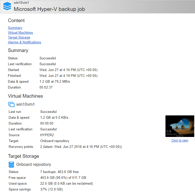 Alas!ย After only a few simple steps to get our NAKIVO Backup & Replication environment configured correctly, including email configuration, screenshot verification configuration, and general backup configuration, you should receive an email confirmation at the end of the process, including a screenshot of the booted Hyper-V virtual machine.ย If you click theย click to view link, you will see a larger image presented for screenshot verification.