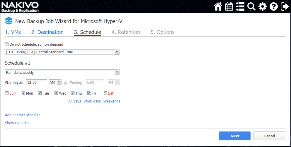 Theย schedule screen allows configuring the backup schedule including the day(s) and time.ย Additionally, here you can chain schedules together as well.