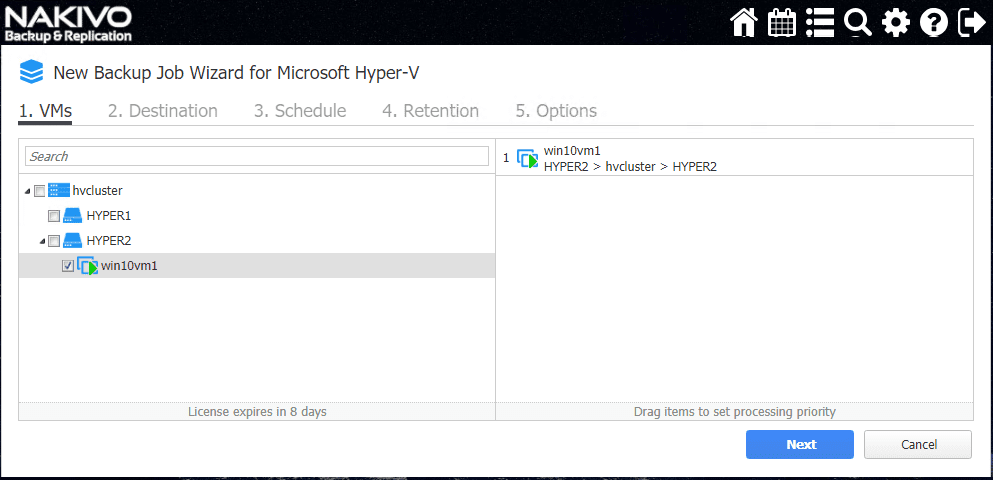 The first step with any kind of backup job with NAKIVO is choosing the virtual machine from inventory you want to backup.ย Here we are selecting our Hyper-V cluster and the VM we want to backup.