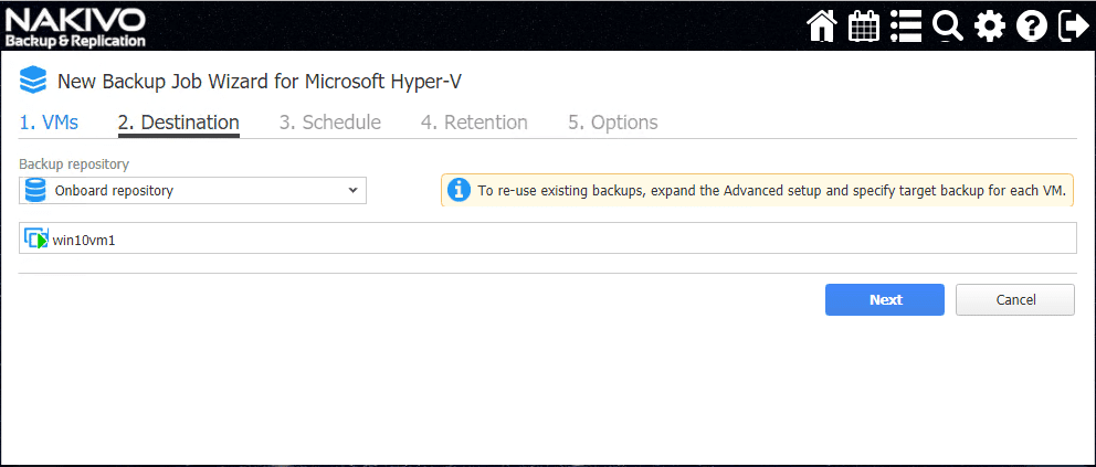 Next, select the destination backup repository for storing the Hyper-V backup.