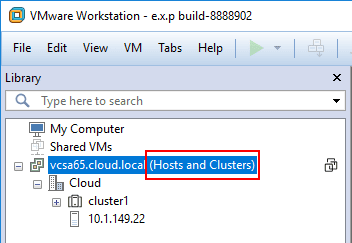 Below, one of the first things I did was connect the VMware Workstation Pro Tech Preview 2018 to my existing vCenter 6.5 Server to check out the “hosts and clusters” view. The small icon to the right switches back and forth between this new view and the “virtual machines” view.