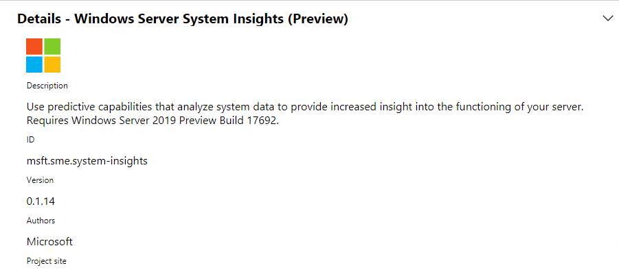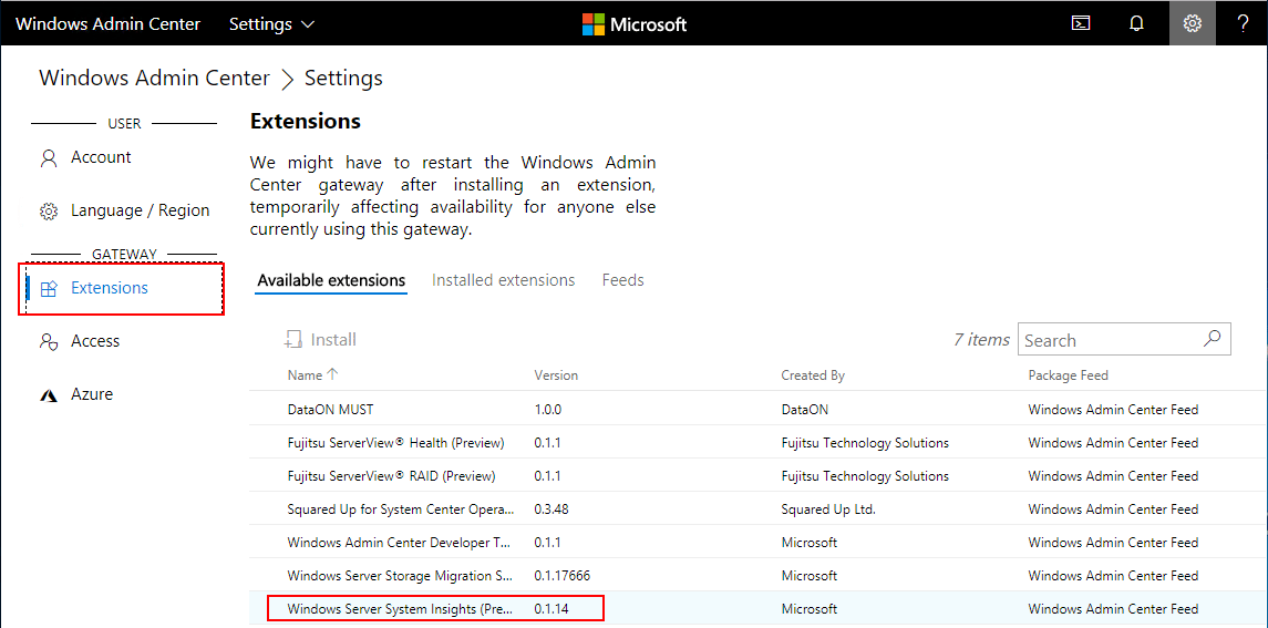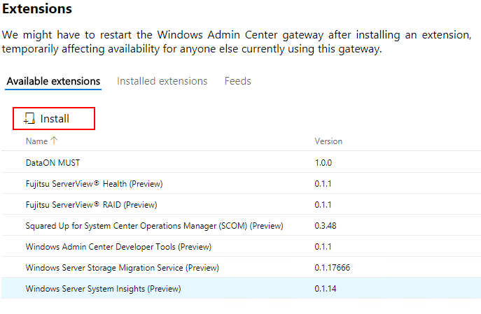 Clickย Extensions and you will see theย Available Extensions listed below.ย One of the available extensions is theย Windows Server System Insights “Preview” module.