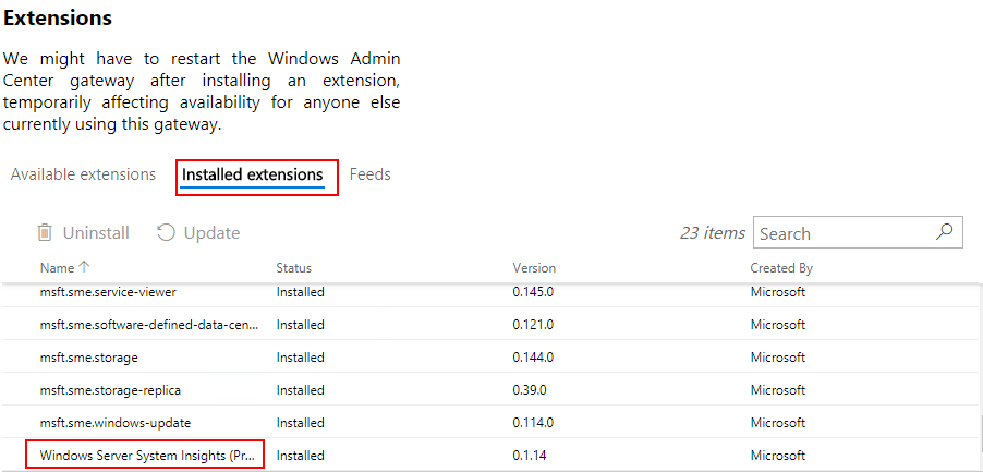 After a brief installation, you can click in theย Installed extensions and you should see the Windows Server System Insights module listed asย Installed.