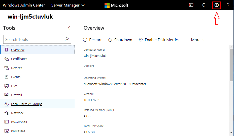 To get to the area of Windows Admin Center to install theย System Insightsย extension, click the little settings cog in the top right hand corner.