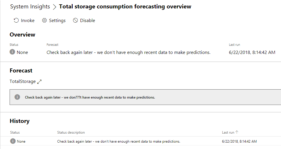 If you click one of the Capability names hyperlinks, you will be taken to the configuration of the particular forecasting you want to setup.ย After clicking theย Invoke button, you will see the forecast module “armed” so to speak and it will start gathering data.ย You will see theย Check back again later – we don’t have enough recent data to make predictions displayed until enough data is gathered which will take a while.