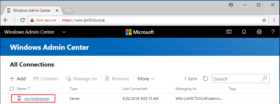 I am not detailing the Windows Admin Center installation as it is straightforward.ย By simply downloading the Windows Admin Center MSI and running the installation, you are up and running in just a couple of minutes.ย Below, you see the newly installed Windows Server 2019 server ready to be managed with Windows Admin Center.