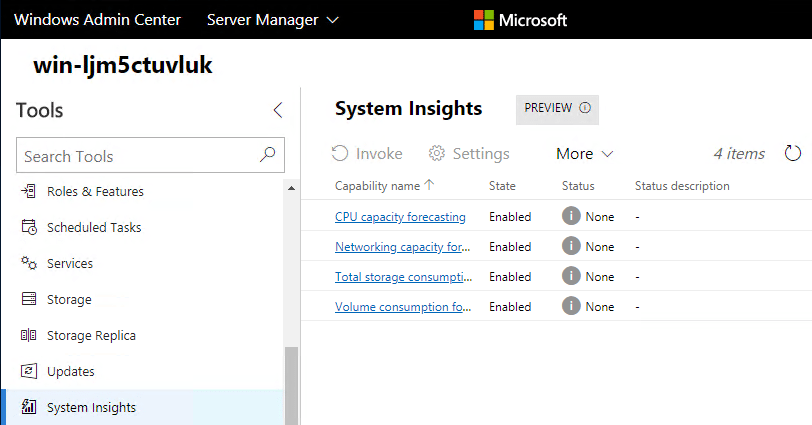 Windows Server System Insights uses predictive capabilities to analyze system data to provide increased insight into the functioning of your server.