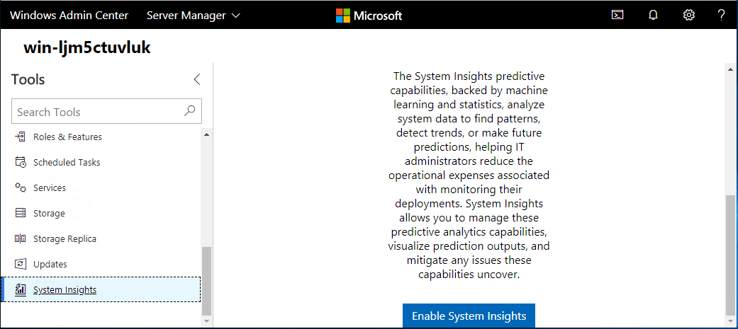 Now, you can navigate back to theย Tools section in Windows Admin Center and at the bottom, theย System Insights menu is now listed.ย You still have toย Enable the extension however.ย As you see below, there is anย Enable System Insights button to begin enabling the module.