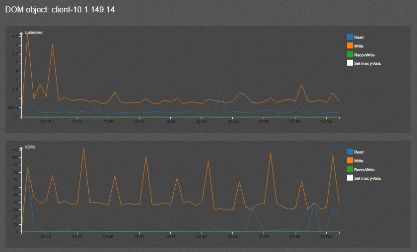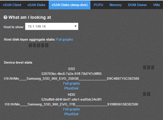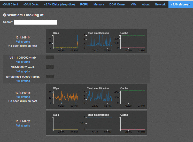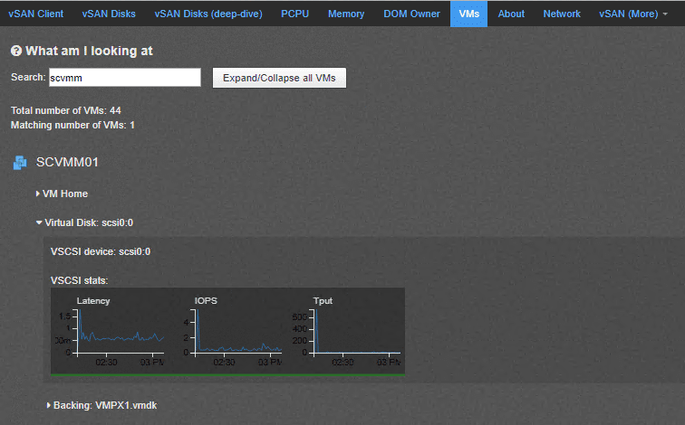 A really great view with vSAN Observer is the VMs dashboard view that allows you to drill down onto a specific virtual machine and see the vSAN performance of that specific VM along with the specific VMDK along with latency and IOPs.