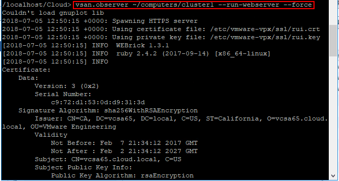 - If you want to only run it via HTTP, you can use the commandย vsan.observer ~/comnputers/<your cluster name> –run-webserver –force –no-https