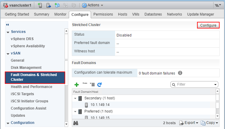 Now, for the witness host.ย Noteย Prior to the steps below, I added the Witness Host to the new vCenter environment.ย Navigate toย Configure >> Fault Domains & Stretched Cluster >> Configure.ย This will begin theย Configure vSAN Stretched Clusterย wizard.