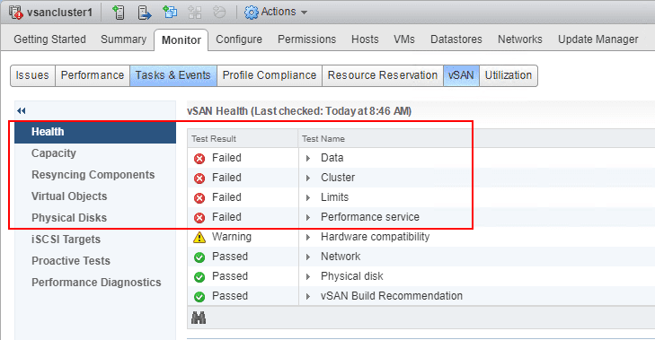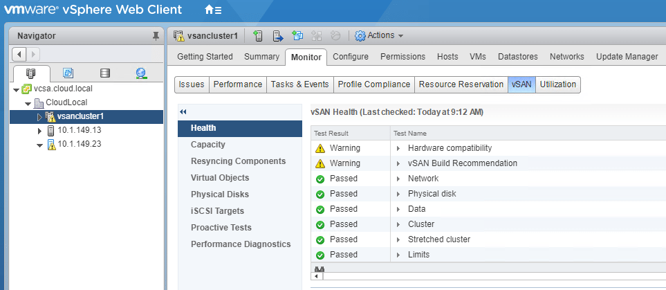 After a couple of minutes, theย Failed states went away and I was back to minor warnings, at least for a lab environment – Hardware compatibility andย vSAN Build Recommendation due to my.vmware.com login credentails not being configured.ย Everything is running healthy and back to normal for the lab.