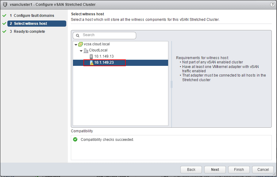 Running through the wizard, you configure fault domains, and select the Witness Host.ย Compatibility checks should be successful.