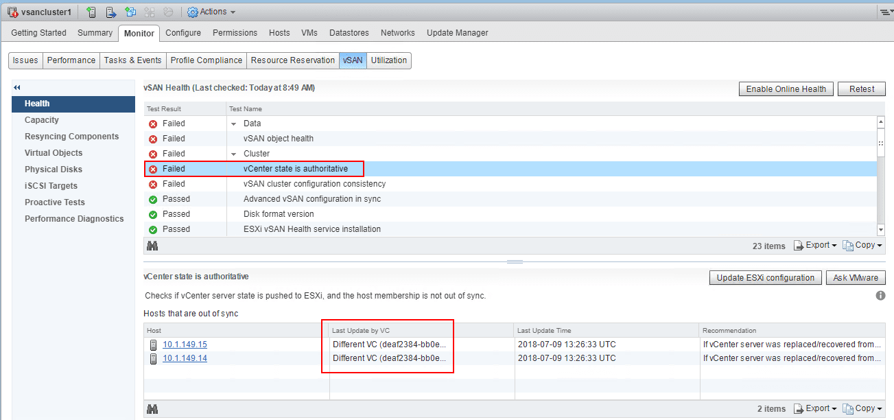 Ok, now for some cleanup.ย After all the hosts were added, I began looking at the failures.ย After the hosts were added, the Data failure and vSAN object health failure went away after some time once objects resynced, etc.ย However, I still had the vCenter state is authorizedย failure along with theย Different VCย error showing.ย To resolve this, click theย Update ESXi configuration from the screen below.