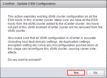 A note here as described in the dialog box, this overrides existing vSAN cluster configuration on all the hosts in the vSAN cluster.ย You want to make sure everything is configured as you want along with all the hosts added to the cluster as this will result in hosts being removed by forcing the configuration update.