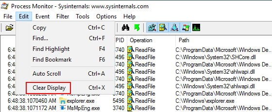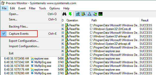Under theย Fileย menu, you will find theย Capture Eventsย menu option.ย By default this is selected.ย You can click or unclick the option to capture events.ย This is handy when you want to have only as little information as possible displayed in the Process Monitor display when troubleshooting an event.ย I like to stop the capture, clear the display, and then have the error ready to reproduce.ย Quickly enable the Capture Events option and produce the error and then disable the capture of events again.ย This way you only have information that is relative to the error captured.