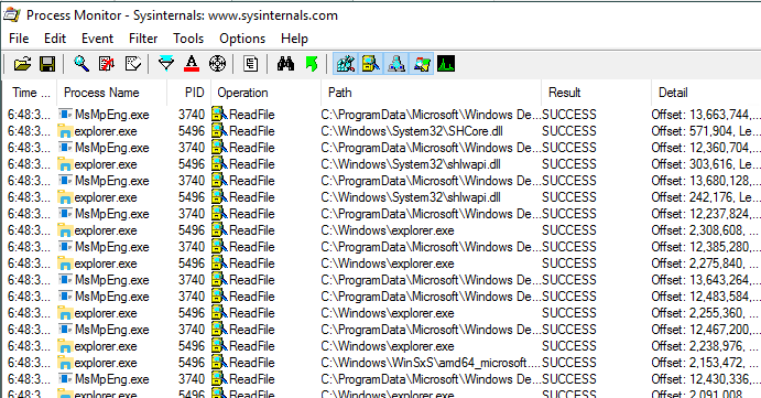 You will see the interface that looks like the following.ย When you launch it, Process Monitor will immediately start gathering information on all running processes and other system activity.