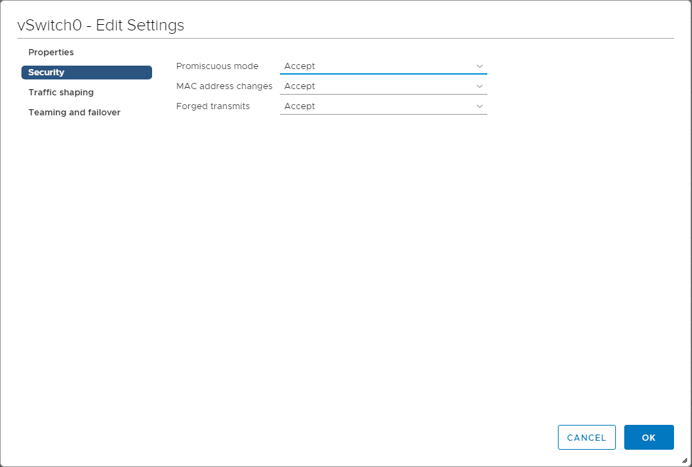Below, looking at the properties of a Virtual Standard Switch, underย Security setting promiscuous mode and forged transmits toย Accept.