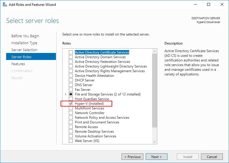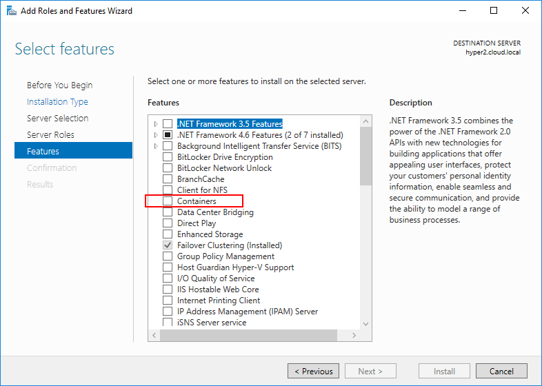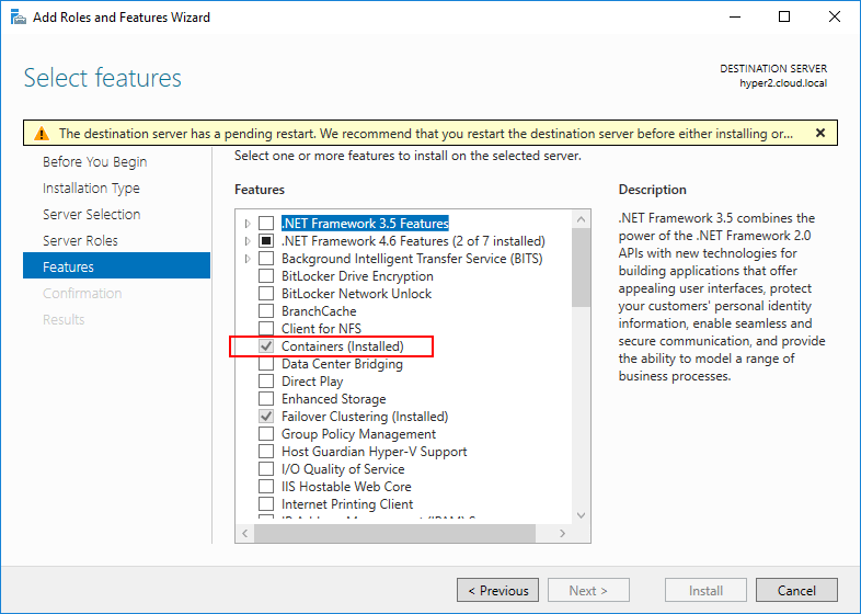 The first thing to be considered are the Windows Roles and Features.ย If you are enabling container support on a Hyper-V Server that already exists, you will already have the Hyper-V role installed.ย However, there is an additionalย Containersย featureย that needs installed also.ย This can be done with either PowerShell or using the Server Manager.