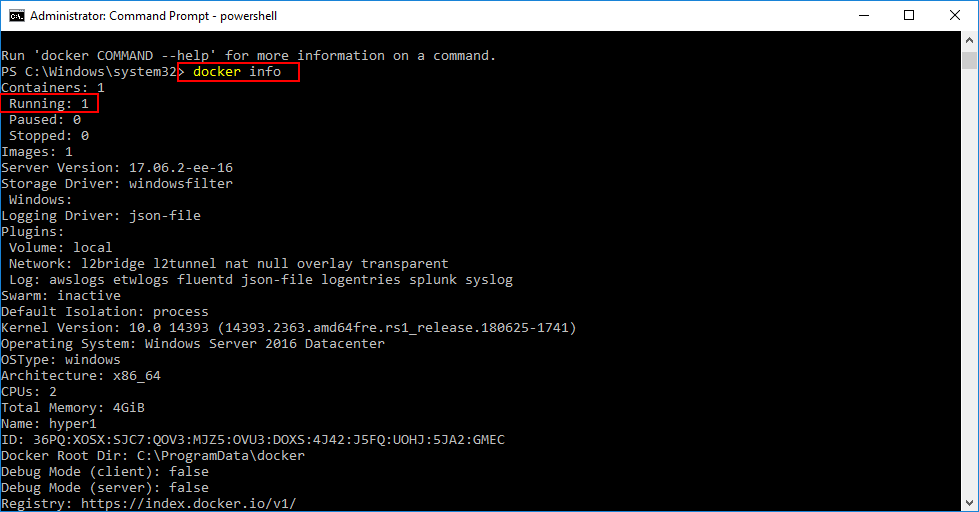 As you can see,ย Installing and Configuring Windows Server 2016 Hyper-V containers is fairly straightforward.ย It involves installing the components required from a Windows Server perspective (Hyper-V and containers role and feature respectively).ย Additionally, you have to pull down the Windows Server base image that will serve as the container host in the nested Hyper-V configuration.ย There are a number of great Docker commands that allow working with and seeing Hyper-V container information.ย Stay tuned for more Hyper-V container related posts.