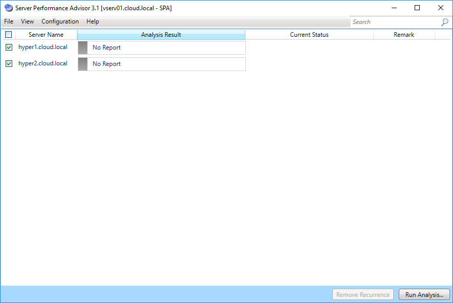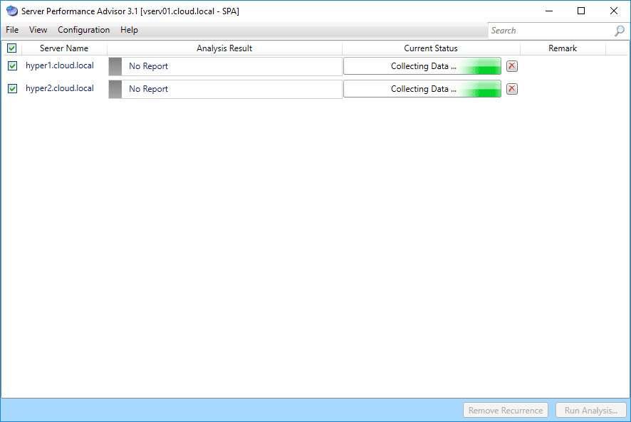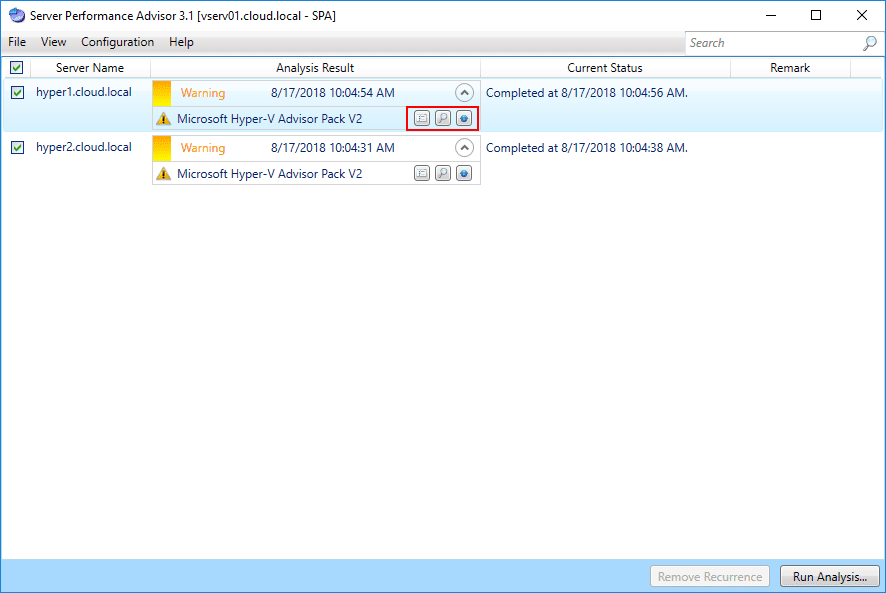 Now, we have the connections setup for the Hyper-V servers.ย You can simply check the box next to the servers or the check all box, and then hit theย Run Analysisย button.