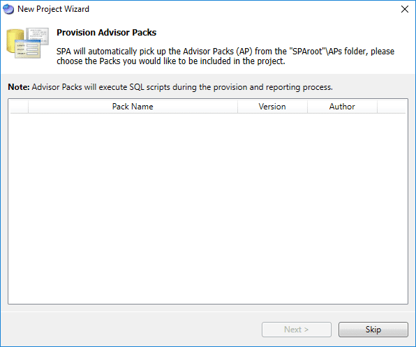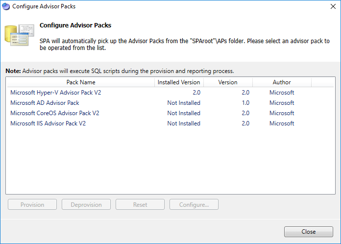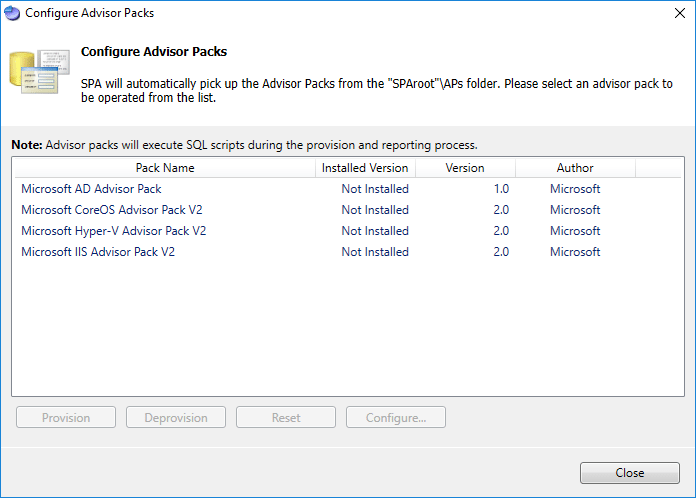 Here you can provision advisor packs.ย The screen I captured below didn’t correctly see the advisor packs that are included as in my case the extraction didn’t work correctly on the first run.ย I re-extracted the CAB and was able to see the included advisor packs.ย We will see them below.