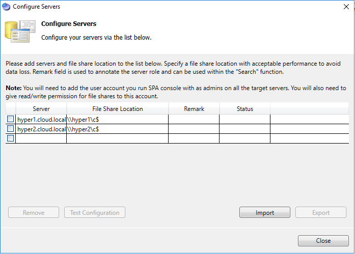 Here on theย Configure Servers screen, you setup the connections to your Hyper-V servers.ย The File Share Location must also be populated.ย This is where the logs will be stored from SPA.