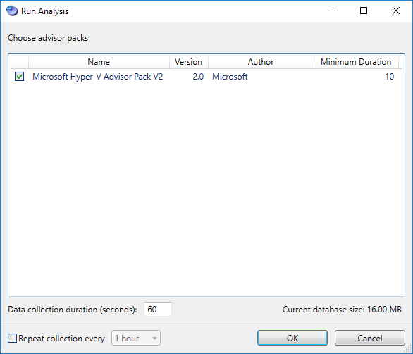 In the Run Analysis screen, choose the advisor pack you want to use in the run.ย Here is where you also configure the run duration and you can also choose toย Repeat collection everyย option.