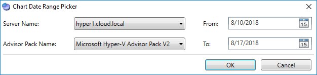 In clicking the View Charts option, you will get to pick the server, advisor pack name and the start and finish dates for displaying the data.