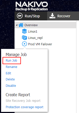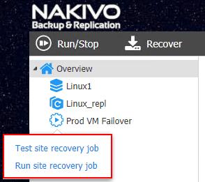 - Run site recovery job – This is the option where you would actually perform the actions in the site recovery job.