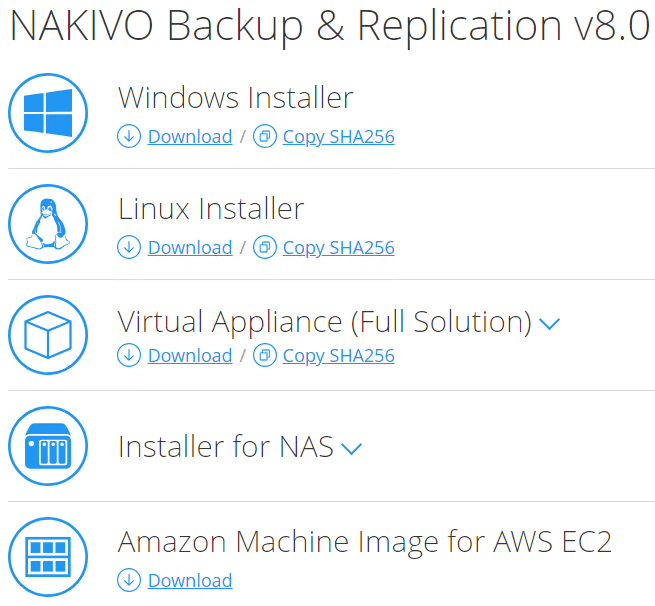 NAKIVO offers an extremely flexible solution to provision their data protection solution.ย The available installers include: