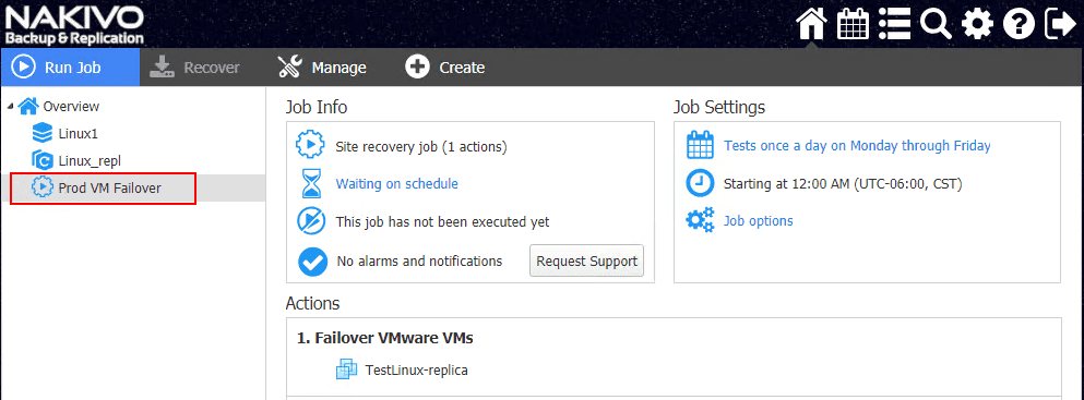 The Site Recovery job is successfully created.