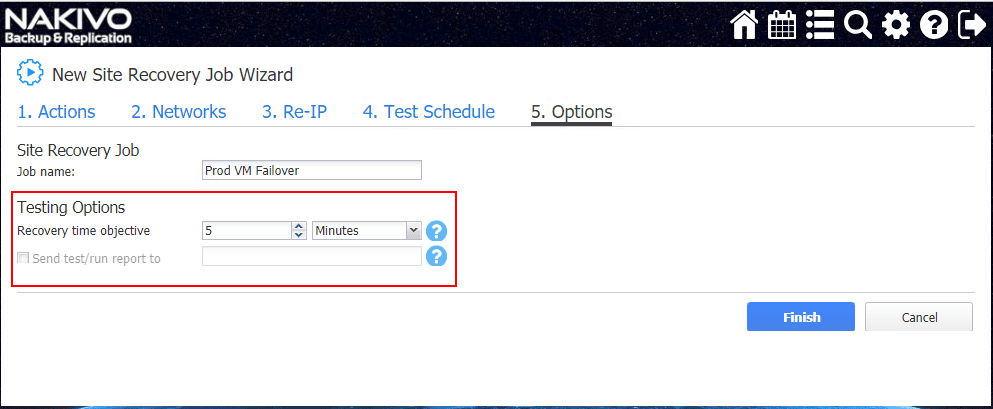 In theย Options screen, you have a really important setting to configure here – theย Recovery Time Objective.ย This allows you to basically attach an SLA to the Testing Options so that real world SLA metrics can be tested along with the actual site recovery job and its associated actions.ย Clickย Finish after configuring the RTO options.