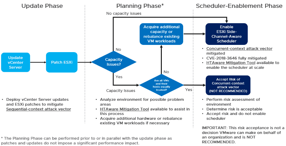 With the planing phase, you start to plan on implementing the Concurrent-context attack vector mitigation.ย With this phase, VMware has introduced anย HTA Mitigation Tool that has as its purpose the complete mitigation of the L1 Terminal Fault (L1TF) vulenerability found in CVE-2018-3646.ย The HTA Mitigation Tool requires enabling the ESXi Side-Channel-Aware Scheduler.ย The scheduler is not enabled by default.