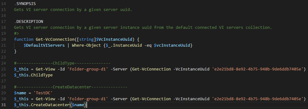 #----------------- Start of code capture ----------------- <# .SYNOPSIS Gets VI server connection by a given server uuid. .DESCRIPTION Gets VI server connection by a given server instance uuid from the default connected VI servers collection. #> function Get-VcConnection([string]$VcInstanceUuid) { $DefaultVIServers | Where-Object {$_.InstanceUuid -eq $vcInstanceUuid} } #---------------ChildType--------------- $_this = Get-View -Id 'Folder-group-d1' -Server (Get-VcConnection -VcInstanceUuid 'e2e21bd8-8e92-4b75-948b-9de6ddb7405e') $_this.ChildType #---------------CreateDatacenter--------------- $name = 'TestDC' $_this = Get-View -Id 'Folder-group-d1' -Server (Get-VcConnection -VcInstanceUuid 'e2e21bd8-8e92-4b75-948b-9de6ddb7405e') $_this.CreateDatacenter($name) #----------------- End of code capture -----------------
