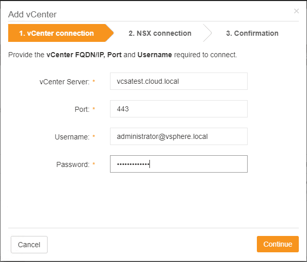 This launches theย Add vCenterย wizard.ย On theย 1. vCenter connection step, added the name of the vCenter Server, credentials, etc and hitย Continue.