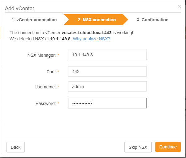 On theย 2. NSX connection step, Runecast will prepopulate the NSX Manager address that is registered in vCenter Server, so you should’t have to enter this information in as it is pulled automatically.ย You canย Skip NSX as well if you don’t want to configure this with Runecast for an NSX configured vCenter.