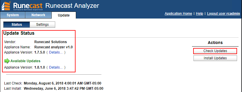 If you haven’t upgraded your Runecast Analyzer appliance to the latest version, chances are you may not be running a previous version of Runecast before NSX support was introduced (v1.8.0).ย To ensure you are upgraded to the latest version of Runecast available (v1.8.X and higher) which includes NSX support, the process involves logging into the Runecast “VAMI” interface on port 5480 and running theย Upgrade process.ย At the time of this writing, the latest version isย v1.8.1.