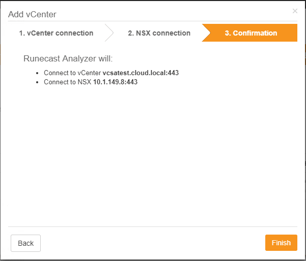 On theย 3. Confirmation screen, Runecast will display the connection information that has been configured.ย Clickย Finishย to finalize the configuration.