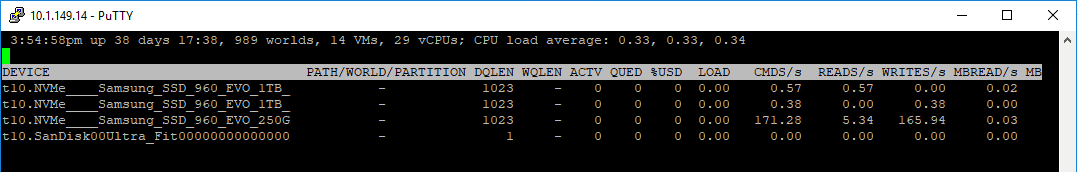 Below, is not a great example of showing LUNs as these are DAS devices.ย However, in an iSCSI environment, you would see your device names with the above ESXTOP configuration.