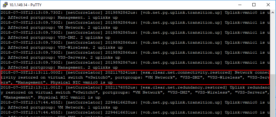 A great log resource to take a look at when seeing if there are potential performance issues with storage or in general is theย vobd.log file.ย This is located in theย /var/log directory.ย You can take a look at the log with the following command after changing the directory to the /var/log location.ย As you can see below, it captures network related events.ย Also, if you have storage latency issues, you will get messages regarding storage performanceย deteriorated with device names, etc.