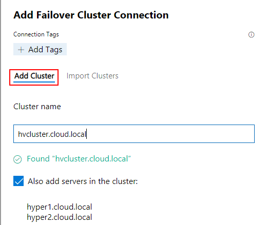 Under the Add Cluster dialog, enter the Hyper-V cluster name. You have the option to add servers in the cluster as well which is checked by default.