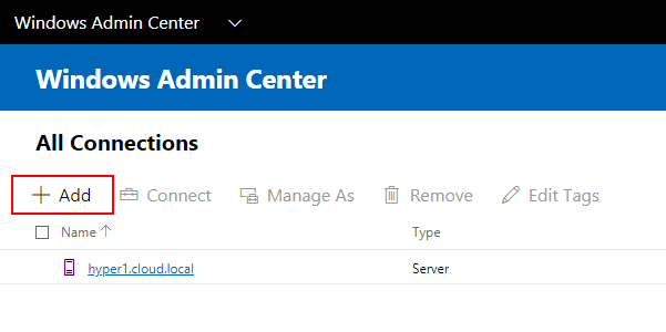 After installing Windows Admin Center Preview 1808, you can begin adding server connections to be managed with the Add button under All Connections.