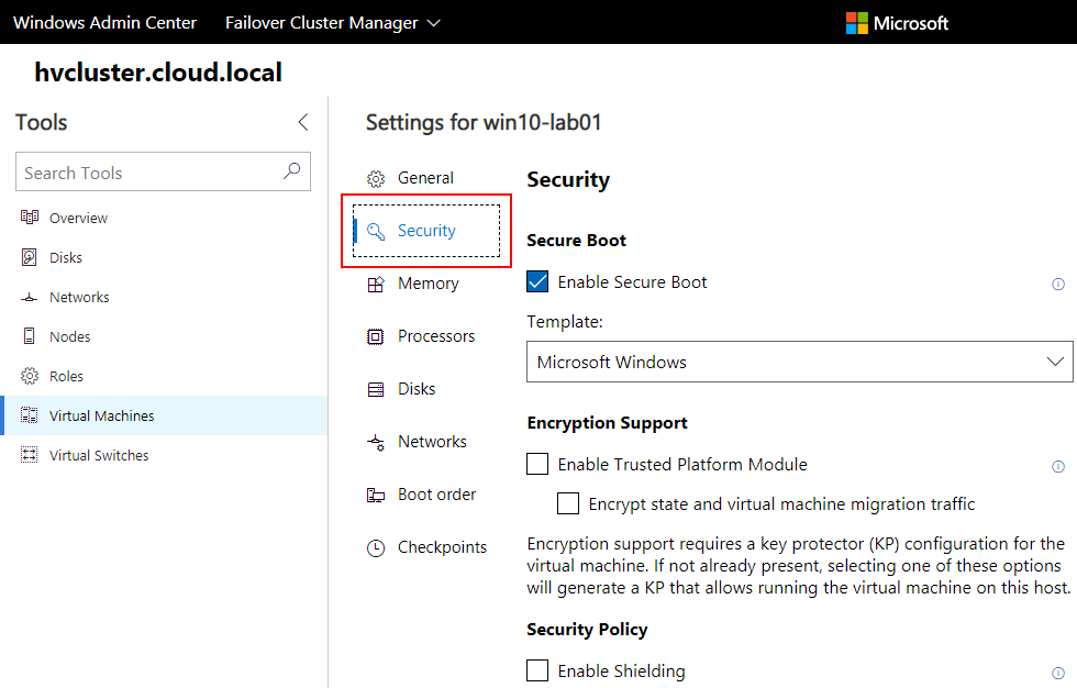New in this version of Windows Admin Center Preview 1808, Virtual Machine Security can now be configured including secure boot, encryption support enabling Trusted Platform Module, state, and migration traffic, and security policy.