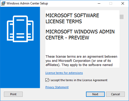 The installation of Windows Admin Center is a “next, next, finish” type process. WAC installs as a web accessible service that runs on the server or a management workstation. Below, I am installing Windows Admin Center Preview 1808 on a Hyper-V host itself. Kicking off the installation of Windows Admin Center Preview 1808. Accept the EULA.