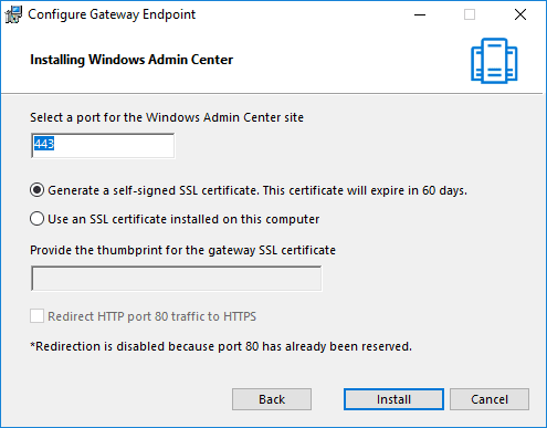 Configuring Windows Admin Center web server port and SSL. You have the choice of generating a self-signed certificate or using another SSL cert thumbprint. Click Install.